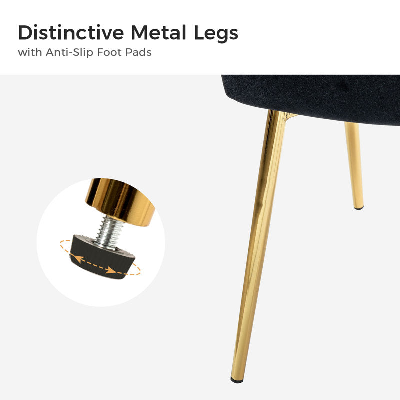 Arriving as a 2-piece set, this dining chair shows off a distinctive wingback silhouette and vertical channel tufting to create a standout mid-century modern accent for your dining table. It has a solid and engineered wood frame that rests on four angled, tapered iron legs with a glam gold finish. The rest of the chair is wrapped in luxe velvet and is filled with foam to provide just the right amount of support as you enjoy your morning cup of coffee or a casual meal with friends. Each chair in this set accommodates 250 lbs