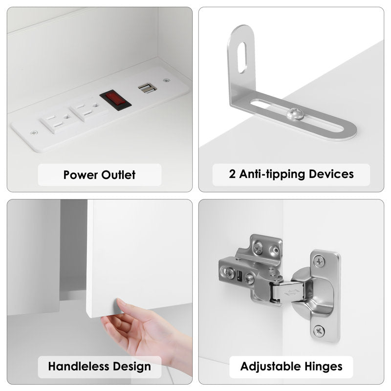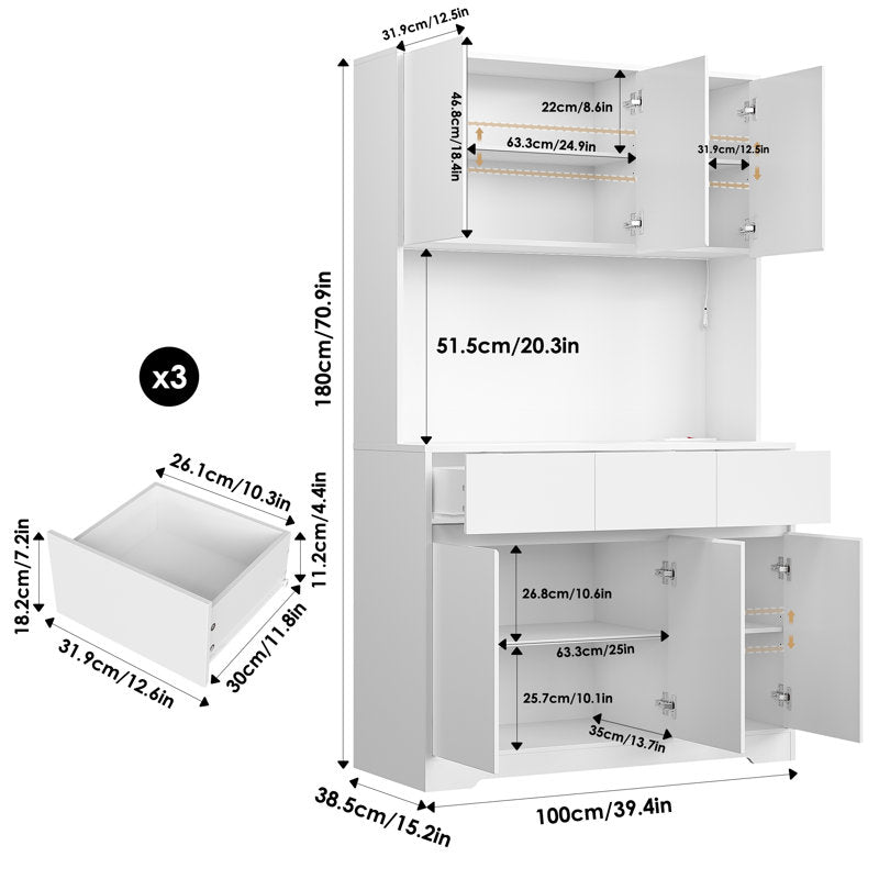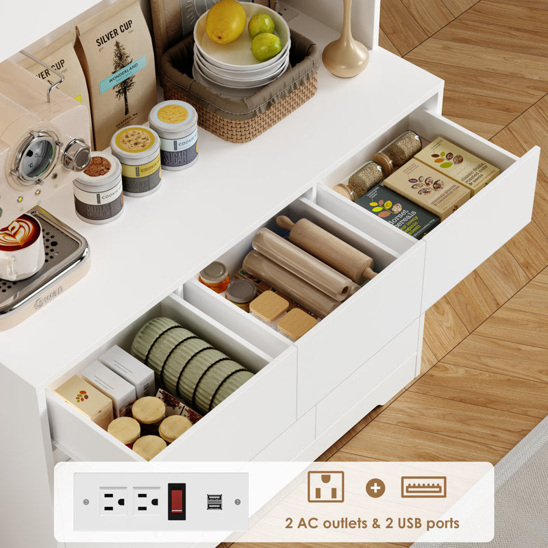 This freestanding kitchen cabinet offers ample storage space for your kitchen, laundry room, or living room. With its simple and elegant design, it blends seamlessly with a variety of décor styles, from modern to coastal. The pantry features four cabinets (three with adjustable shelves) and three drawers, providing plenty of room for cooking appliances and dishes. The handle-free design ensures easy access to the drawers, while the central microwave cutout includes a charging station. Additionally, LED lighting illuminates the work area, enhancing your cooking experience. Safety Reminder: For your safety and to maintain optimal appliance performance, always unplug the charging cable from the USB port when not in use.