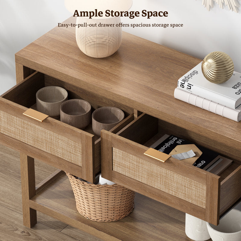Add a touch of bohemian style to your entryway with this console table. Crafted with natural wood grain, rattan-trimmed drawers, and a tiered shelf, these long, narrow sofa tables are perfect for storing your essentials while adding a touch of natural wood to your hallway or entryway. The classic design blends well with any décor style, adding a touch of elegance to your room.