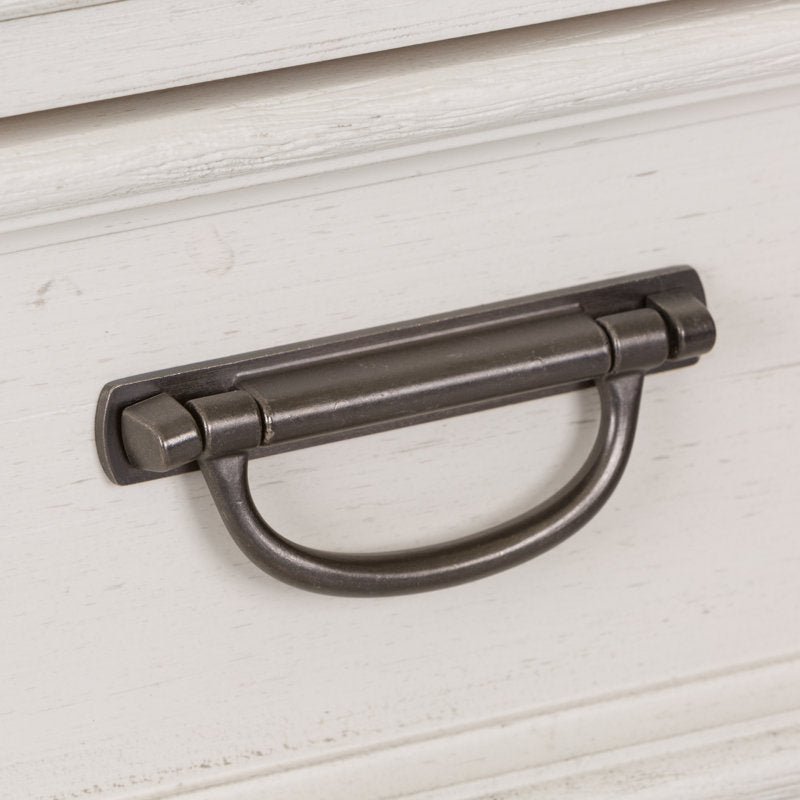 This 3-drawer nightstand is sure to anchor your bedroom in a coastal farmhouse design. It's made from solid and engineered wood and has a distressed white finish with a brown top for an antique look. Crown moulding and four tapered spade feet add to the farmhouse charm. The top drawer has knob pulls, and the bottom two have double drop pulls for an industrial flair. Plus, the drawers offer plenty of space for your bedtime essentials. Built-in outlets in the back keep your devices charged as you sleep.
