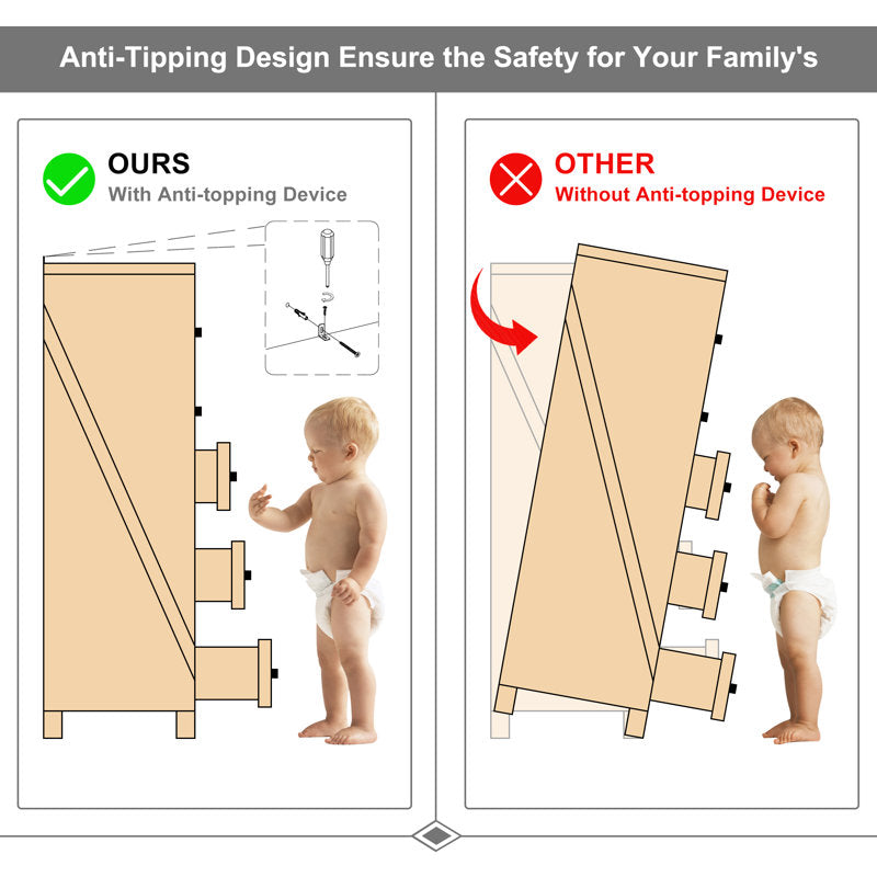 User-friendly Design: The 5 drawers slide easily on ball bearings and the double-coated metal handles allow you to push and pull the drawers without effort, keeping your organized clothes or other items neat; Comes with an anti-tip device on the back, never have to worry about it falling and hitting your kids/pets.