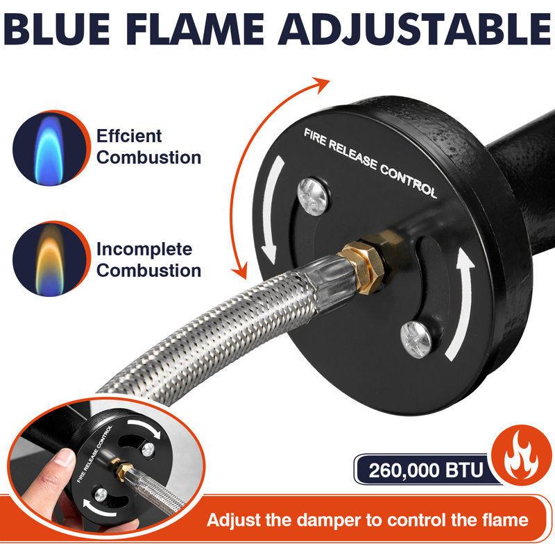 This 275,000 BTU commercial burner features a cast iron head with precise 0-30 PSI control. The military-grade powder-coated frame supports loads of up to 33 pounds. Includes an explosion-proof steel hose for frying turkeys—ready to cook in 3 minutes.