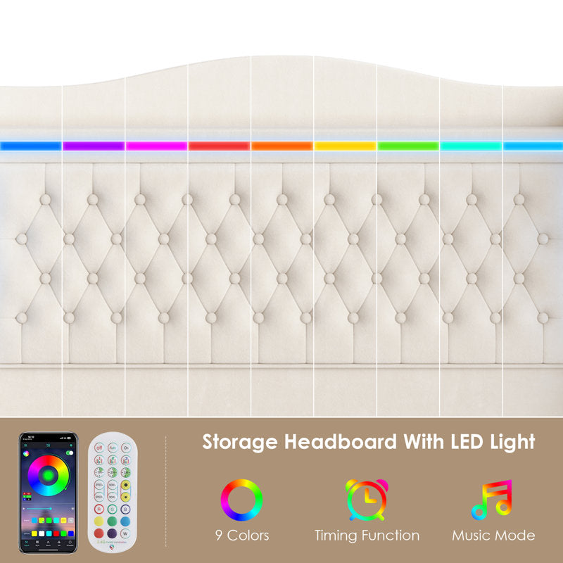 This classic upholstered bed offers a luxurious sleeping experience. Covered in premium velvet, this bed with storage provides both comfort and luxury. The headboard features nine colorful LED lights with six brightness settings and three lighting modes, adjustable to a comfortable, glare-free ambiance for nighttime. The shelf on the headboard is the perfect place to store glasses and photos, keeping your room neat and tidy. This upholstered platform bed with storage drawers provides ample space for linens, out-of-season clothing, and more, making full use of the space beneath the bed.