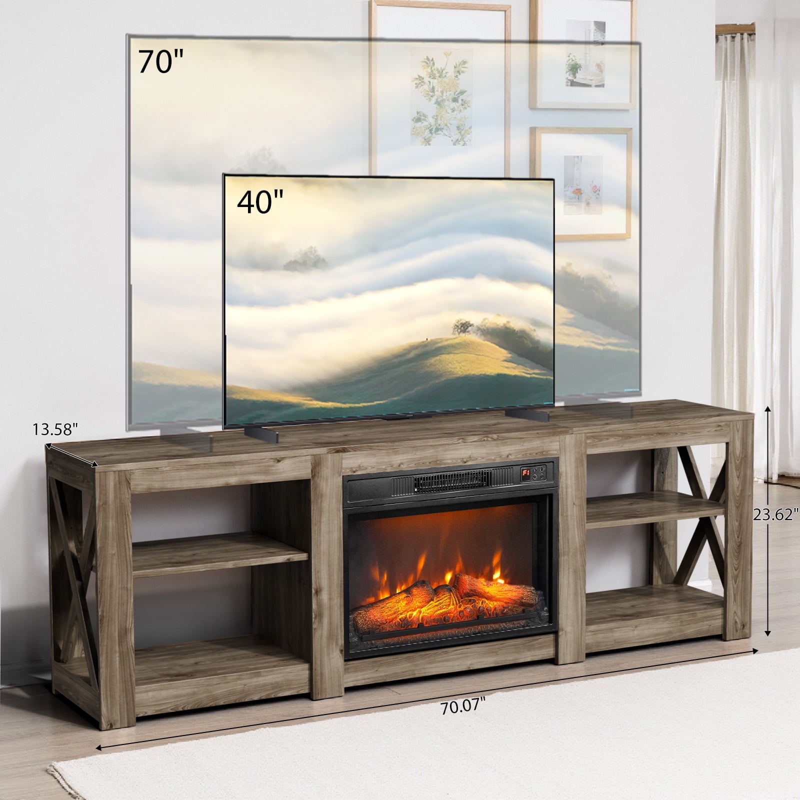 Elevate your living room with the 70" Farmhouse Entertainment Center, a stunning fusion of rustic charm and contemporary functionality. This 70-inch media console features a weathered brown finish with distinctive X-frame side panels and adjustable open shelving, creating the perfect display for your 60-75" television. While the spacious storage compartments keep media equipment organized. Crafted from scratch-resistant engineered wood and weighing just 68 lbs, this rustic TV stand brings farmhouse elegance to any decor style while providing CSA-certified safety features like automatic overheat protection.