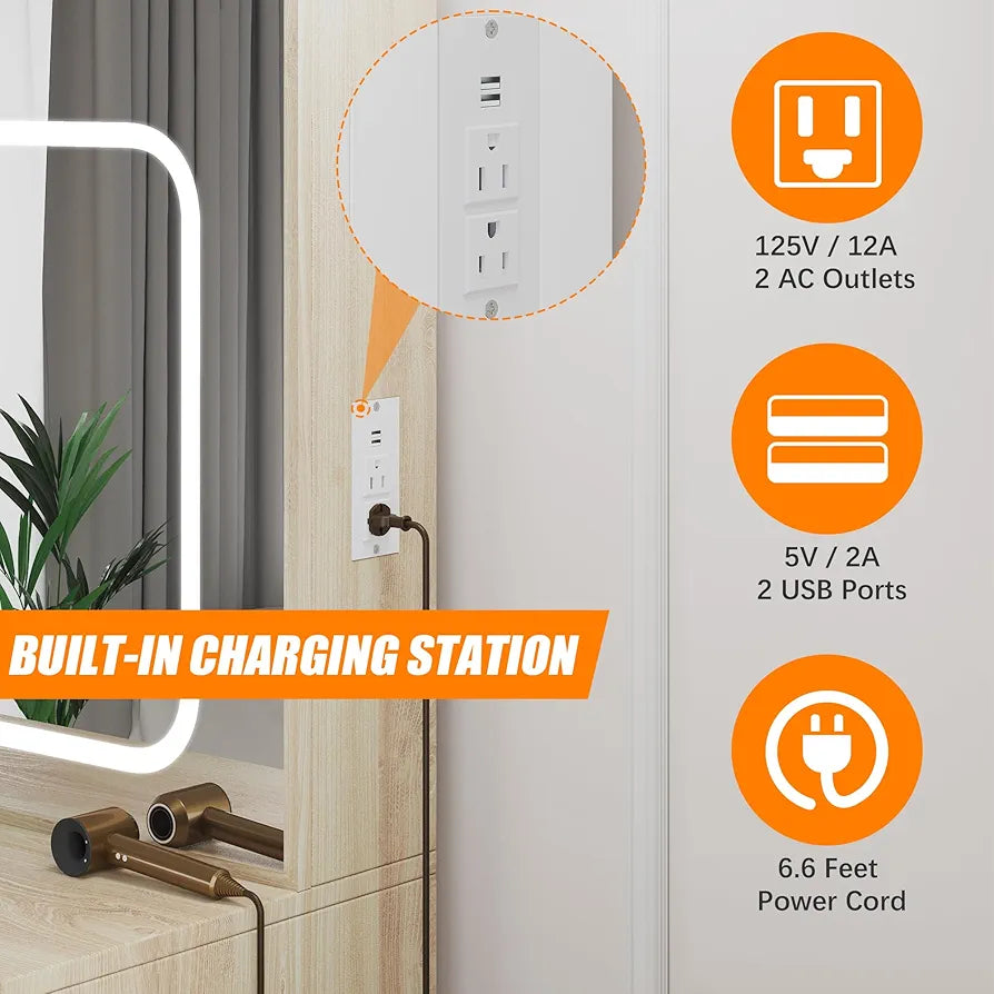 Thoughtful Design Elements - Our vanity mirror with lights integrates functionality with finesse, including a built-in charging station equipped with 2 AC outlets and 2 USB ports for your convenience. Its modern minimalist aesthetic infuses any space with sophistication and charm.