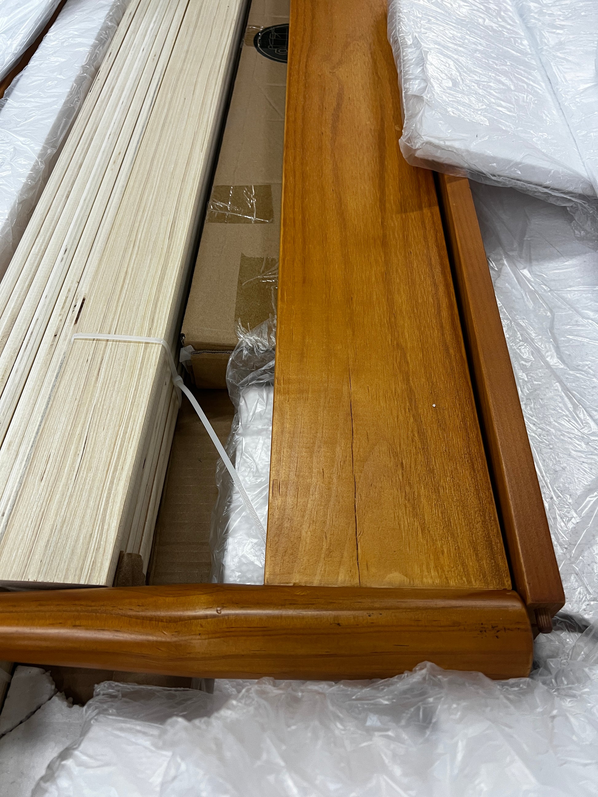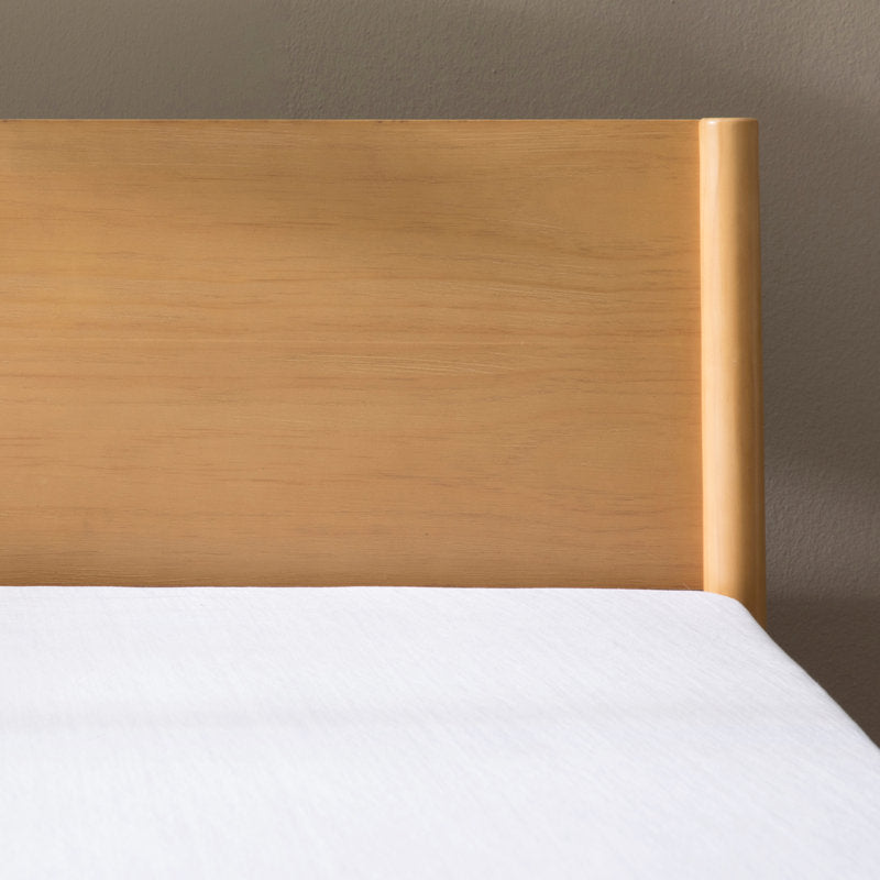 Give your bedroom a mid-century modern makeover with this bed frame that stunningly combines classic elegance and contemporary minimalism. Its rounded legs and a warm, wood-toned finish make a statement, while its low profile accentuates its subtle style. The sturdy headboard offers solid support, and the solid wood frame provides a stable foundation for your mattress without the need for a box spring. Closely spaced wooden slats ensure long-lasting support and breathability, helping extend the life of your mattress. Thoughtfully packed with all the tools, parts, and step-by-step instructions, it ships in one box for easy assembly.